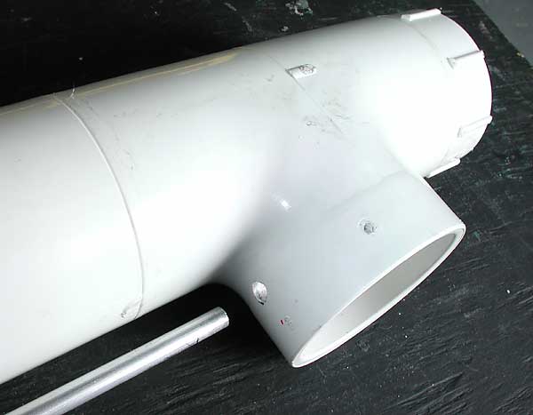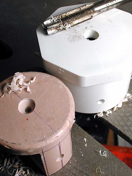 Measure the position of the barrel hole on the 2" plug and transfer it to the 2" T fitting. Use the seams on the fitting (hopefully) as a guide. It should wind up close to where you planned. 3 or more short machine screws hold the 2" fitting in place, these can be drilled first then transferred to the 2" plug. 4 wraps of teflon tape help seal this union. A screw is in position opposite the barrel on the back, this important screw holds the vortex block in place.