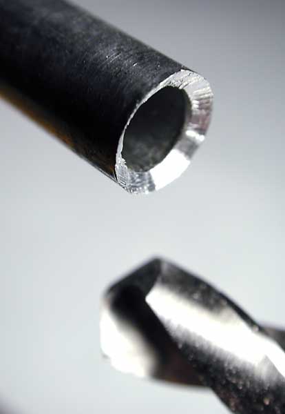 This barrel is made from 1/4" OD x 36" aluminum tubing. The inside diameter is just slightly larger than a .177cal BB. It is so close that imperfections on the inside edge of the barrel can cause ammo jams. A bevel is put on the rim of both sides of the barrel to protect the inside edge. A drill bit is used to cut the bevel and a Dremel to polish it. The barrel holes on the T fitting and 2" plug are enlarged to 1/4". The barrel wrapped with teflon tape should stay in this hole by friction alone. A very shallow 1/4" hole may be added to the edge of the barrel hole on the block to help with the barrel>block interface. If the BB's become dented of deformed, they may get stuck inside a barrel that fits too tightly. A barrel with a slightly larger ID may prevent jams when using recycled ammo.