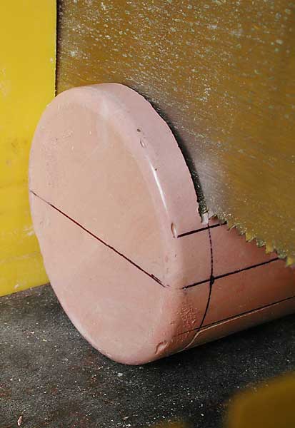 A variety of tools may be used to make these cuts, some with extreme precision. This example uses a hand saw and mitre box. The cuts for the round base should be done first as pictured above. Both of the base cuts need to be even so BB's can flow in from either side. The 2" plug used as a mold does not have parallel sides. A shim is required to make this cut straight.It's a good idea to not cut all the way through and to take your time. The second cuts pictured left are for the sides of the vortex block. The round base will hold the block steady as the bondo falls away. The cuts can be cleaned up with a file or sandpaper afterwards.