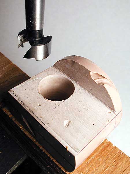 Draw a center line on one of the flat sides, this will help align the vortex hole with the center of the 2" plug. A drill press with a 3/4" forstner bit is used to create a smooth vortex hole in the block. Align the hole with the bottom of the block and the center line. The 3/4" vortex hole goes on the half closest to the muzzle. The hole here is a little high on one side. Bondo can be used to fix this or a new block can be cut from scratch.