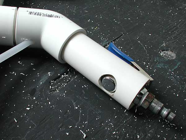 This handle is made from 1" PVC pipe. The storage hook may need to be cut away from the blowgun for it to fit inside. An area of the pipe is cut away the width of the nozzle as pictured above. A 3/4" hole in the back of the handle helps the trigger lie flat inside.