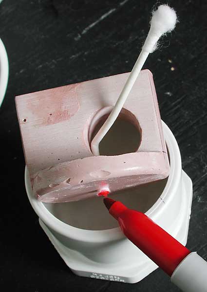 Transferring the air hole to the plug can be done with the aid of a cotton swab and an ink marker. Mark the rotation of the block in the plug before proceeding. Place the swab through the air hole and soak with ink. Carefully put the block in the plug then remove. Drill a 5/32' hole where the ink mark is.