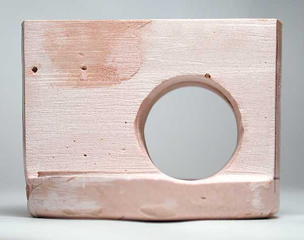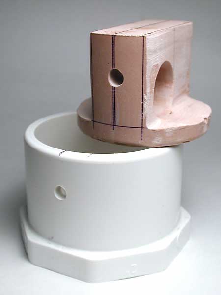 The vortex block is the most difficult part to construct and also the most important. The raw block can be made of any smooth, solid material. Solid PVC rod cut to shape is the ideal solution but could be hard to get. A block of hardwood might also work once turned to a suitable diameter. The block pictured here is made from bondo body filler which works well if made carefully.